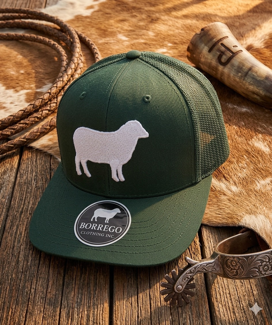 Built for the everyday grind with a touch of Western heritage, the Borrego Signature Trucker Hat delivers a bold, clean look that stands out wherever you go. featuring a crisp white sheep logo embroidered on a deep forest green crown, this cap represents strength, grit, and tradition.